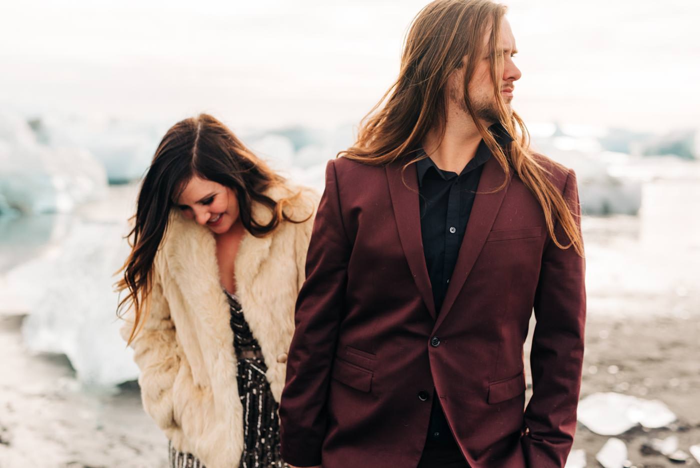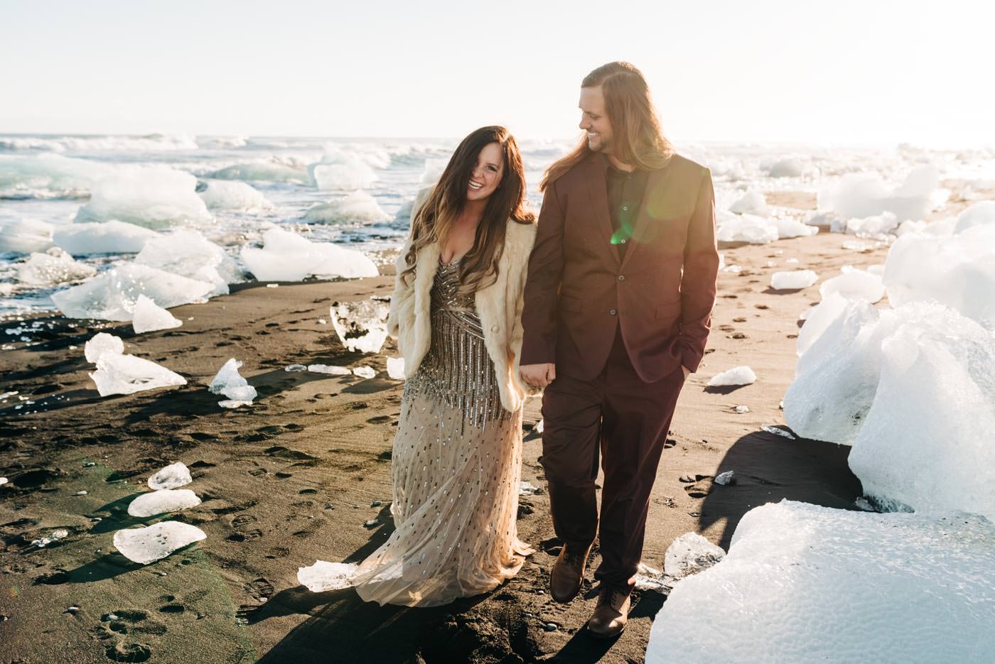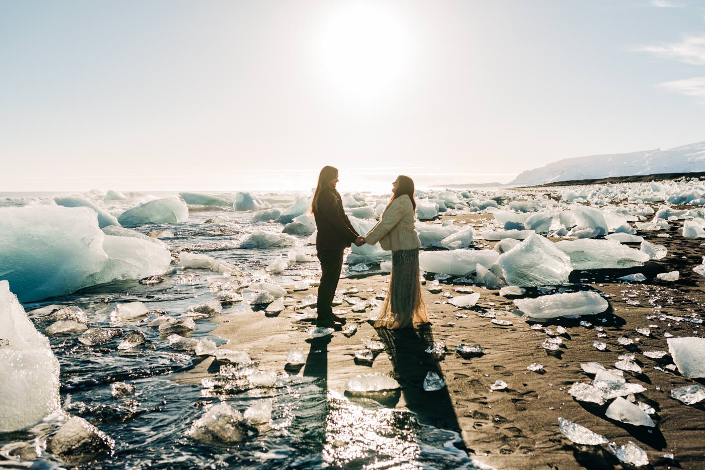Iceland elopements involved a lot of gas station coffee and hot dogs. It’s typically Icelandic fare. The day of the vow renewal we woke up early to make a delicious breakfast of gas station coffee and oatmeal. We were lucky that not too many tour buses had shown up yet because this beach gets insanely busy. But if you’re willing to walk a bit you can easily distance yourself from the main groups. Rob and Lyndi found a perfect spot on the beach. The light was extremely harsh this day, especially with it reflecting off the ice. But it’s an adventure so we all just rolled with the punches.